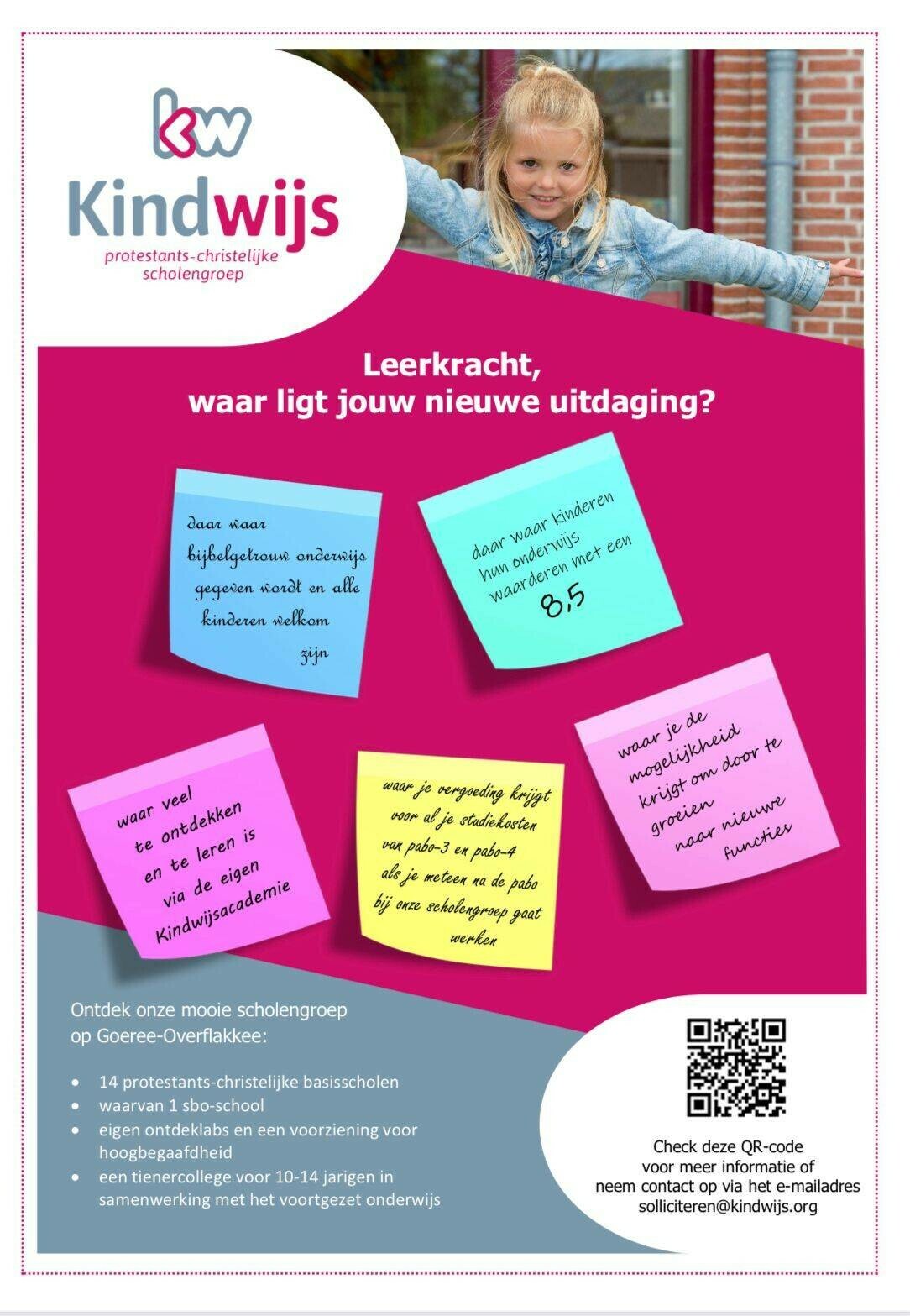 Meer informatie is te krijgen bij de personeelsmedewerker Marleen Heijboer, bereikbaar via telefoonnummer 0187 484 153 en via het mailadres m.h.heijboer@kindwijs.org
